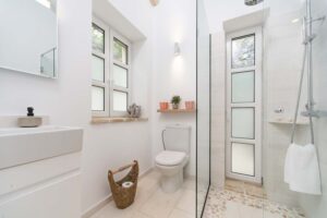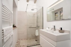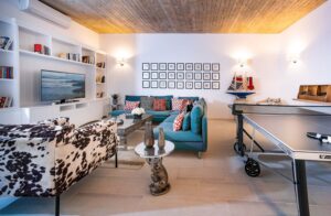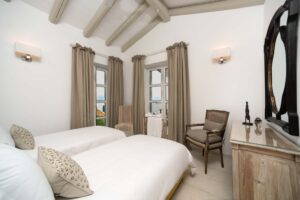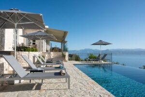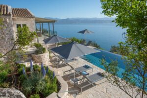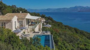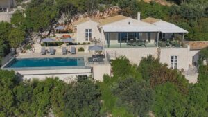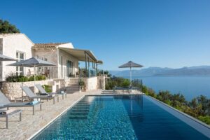 Lovely Gaia on the Kardaki Estate sleeps up to 6 guests and is a perfect for a small family or group of friends. With wonderful far reaching views out over the Ionian sea to the mainland beyond, Gaia has open plan living areas, a fully equipped part open plan kitchen. There are two superking/twin bedrooms with en suite showers rooms on the ground floor. The master bedroom with superking bed, terrace and en suite shower room is on the floor below. On the lower ground floor there is a TV/media room with 55″ TV and table tennis table for fun and relaxation. Outside, terraces make the most of the location and the swimming pool forms a focal point for your stay at the villa. For larger groups, Gaia can be rented in conjunction with adjacent sister villa Eos which sleeps up to 4 guests in 2 en suite bedrooms. The houses are connected via a storeroom/laundry, but each house is completely autonomous with their own parking, terraces, gardens and pools. The houses are connected by a 20m path, so whilst being separate, guests looking for a shared but separate holiday will enjoy the space Eos and Gaia provide. The villa is just a few minutes drive down to sandy Kalamaki beach and under 10 minutes from vibrant Kassiopi with its boat hire, tavernas, bars and boutiques. Please note there are 21 steps down from the drive to the front door of the villa. NB: Owners kindly ask that P20 Suntan Lotion and Mrs. White’s Mozzy Spray not be brought or used on the premises as these products permanently stain the brand new linen/towels.
