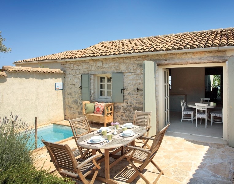 Laurus is the central house of three adjoining properties along the pretty path under wisteria-covered arches that forms the central walkway in Rou.